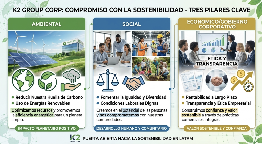 En K2 Group Corp, nos consideramos una puerta abierta en el mercado de LATAM para aquellas empresas comprometidas con la sostenibilidad y la responsabilidad social. Nuestro enfoque en las prácticas ESG (ambientales, sociales y de gobierno corporativo) no es solo una estrategia empresarial; es un compromiso personal que cada uno de nosotros, en la organización, lleva a cabo en su vida diaria. Trabajar con personas expertas que no solo gerencian soluciones, sino que también aplican estos principios en su vida personal, es lo que nos distingue.